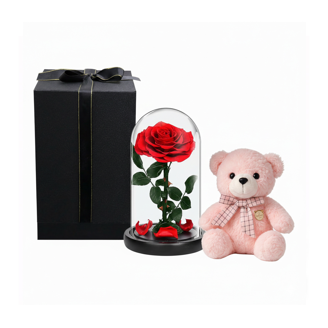 A timeless red infinity rose showcased under a clear glass dome, accompanied by an adorable teddy bear. A perfect gift of love and affection.