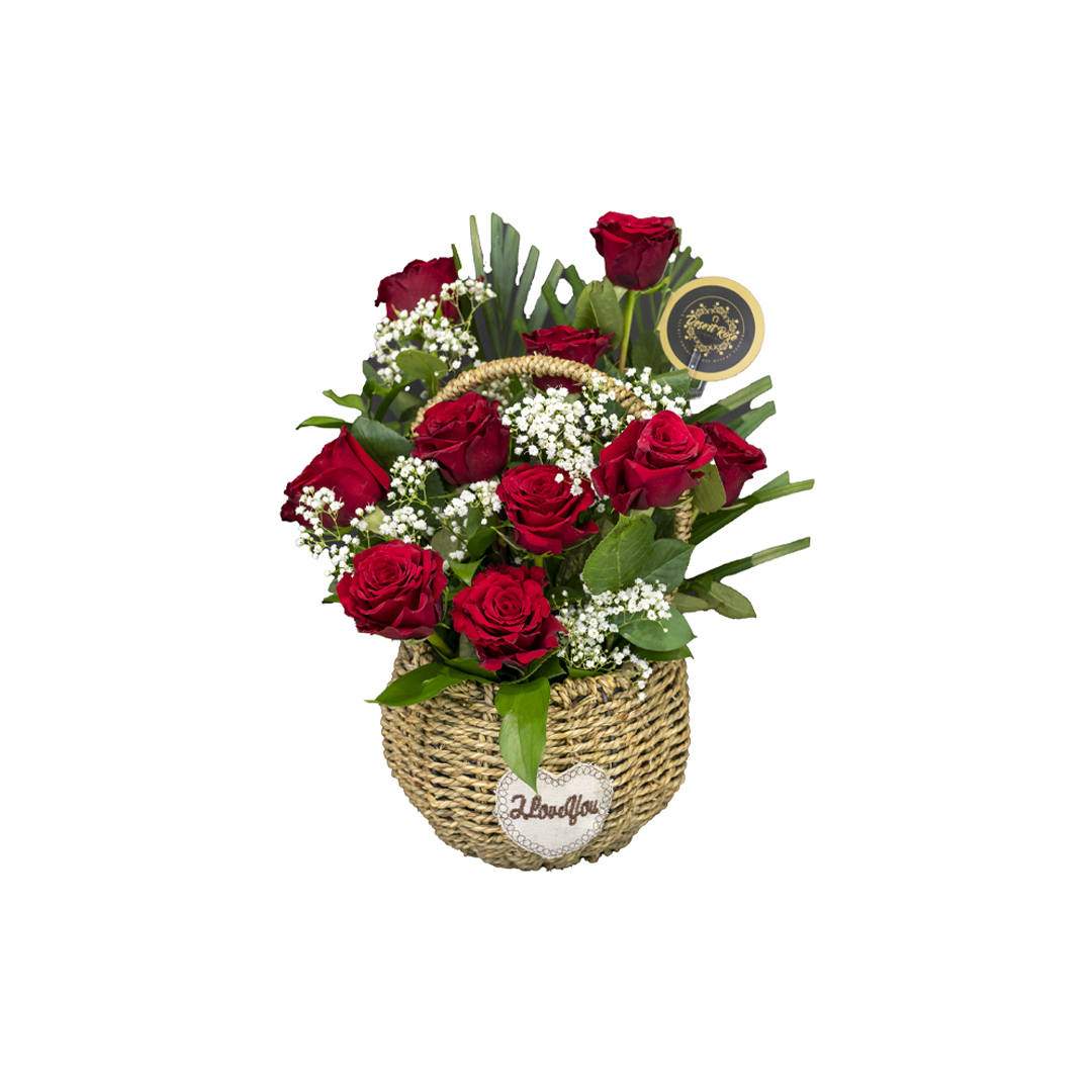 A classic arrangement of 10 fresh red roses beautifully presented in a charming flower basket — perfect for expressing love and admiration.